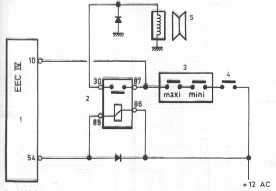 Rys. 12.27. Schemat Instalacji elektrycznej klimatyzacji 1 — elektroniczne urządzenie sterujące systemu wtrySkOWO-zapłonowego EECIV, 2—przekaźnik klimatyzacji, 3—czujnik ciśnienia klimatyzacji, 4—wyłącznik odszraniania, 5—sprzęgło elektromagnetyczna klimatyzacji