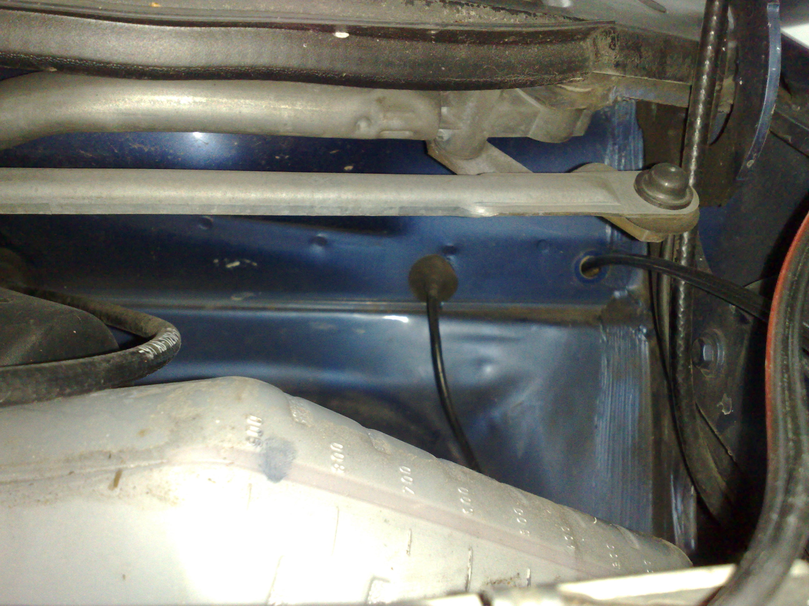 Przy lewej nodze pasarzera z przodu wchodzą dwa węże od nagrzewnicy i idą do komory silnika.