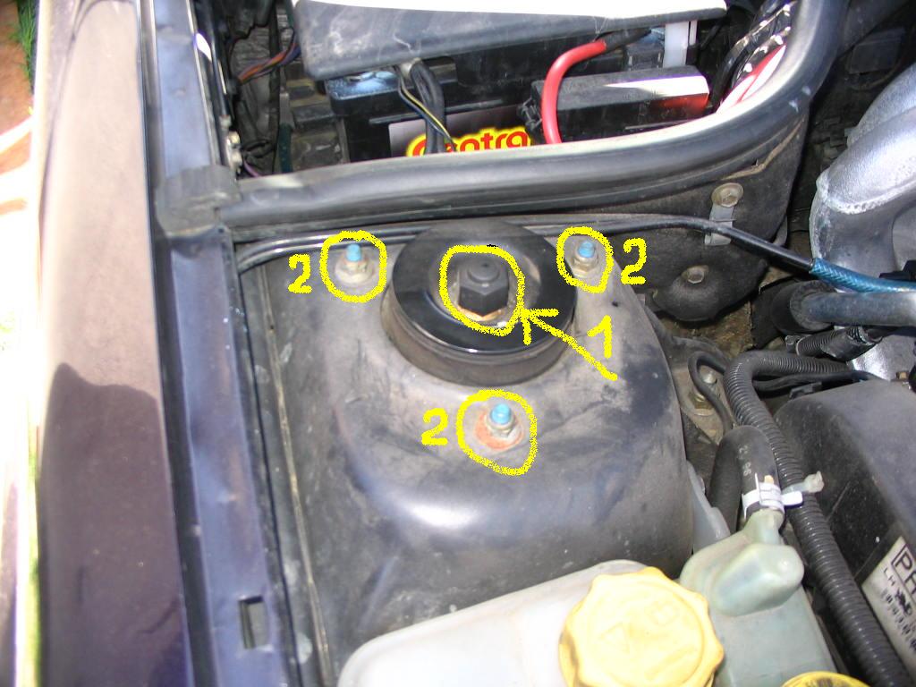 Ściągamy ( jeśli jest ) plastikową zaślepkę z nakrętki amortyzatora - u góry pod maską - w komorze silnika .