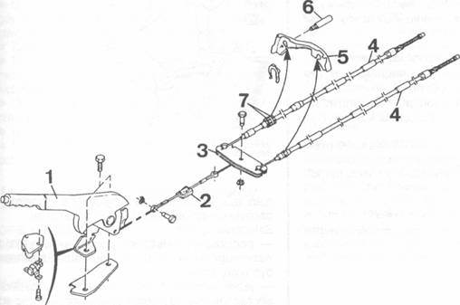 zd1. 1- dźwignia, 2- linka przednia, 3 - zaczep, 4 - linki tylne, 5 - wspornik, 6 - kołek blokujący, 7&amp;#8212;nakrętka regulacyjna i przeciwnakrętka