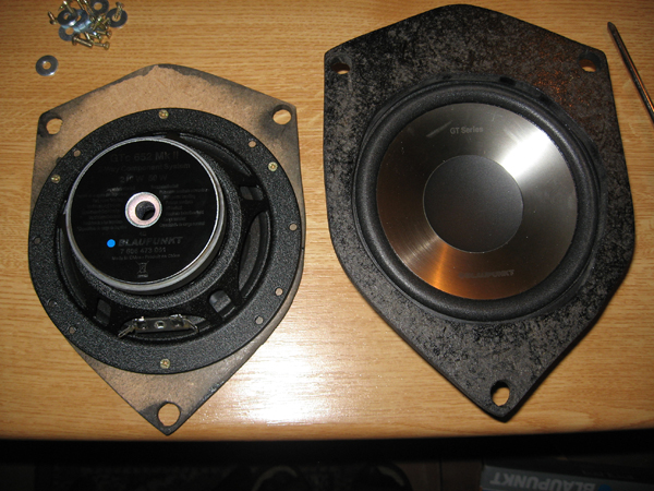 Jakiś czas temu kupiłem sobie głośniki blaupunkta z zamiarem założenia ich na tył, od sima (dzięki!) dostałem za firko przejściowki na tył... Niestety okazało się, że są to przejściówki na głośniki 16,5cm (a nie na 16cm!!). Głupie pół centymetra, a robi ogromną różnicę, nawet gdybym chciał to przerabiać, nie wiem czy to rozsądny krok. Otwory mocowania głośnika byłyby zbyt blisko krawędzi, trzeba by wypalać plastikowy "kołnierz"...
