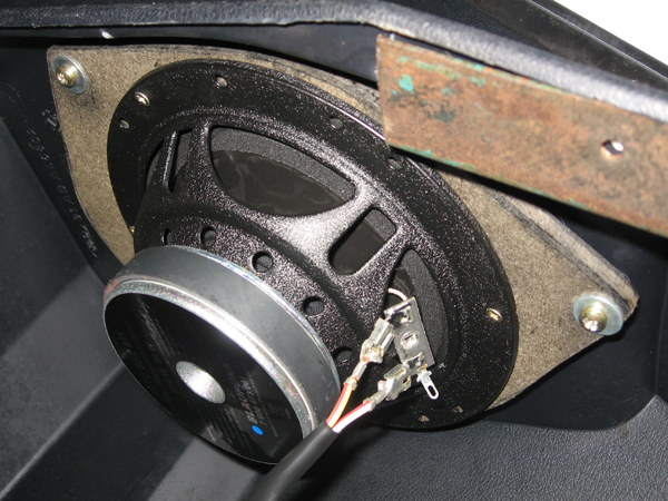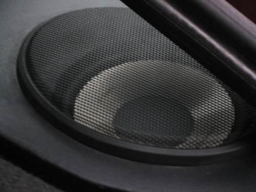 12. demontujemy stare maskownice... plastik wywalamy, a czarną siatke z gumą wciskamy z powrotem w otwory na głosniki. zaginamy o 90 stopni na zewnatrz "języczki" maskownic, bo inaczej będą nam przeszkadzac w prawidłowym montarzu przejsciowek.