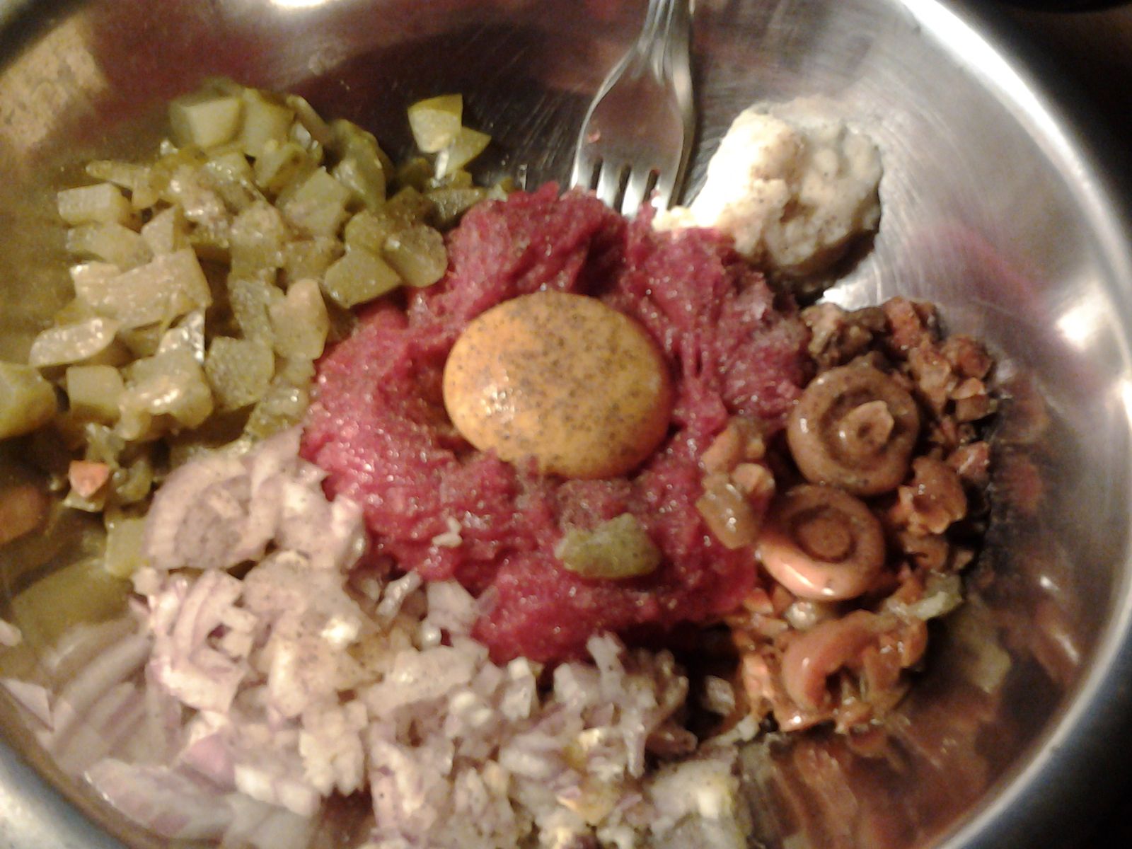 Znajomy dodaje jeszcze odrobinę szprotek wędzonych z puszki... nigdy tego nie robiłem ale musze spróbować choć moim zdaniem rybka zabije smak tatara... Póki nie spróbuję to nię nie przekonam