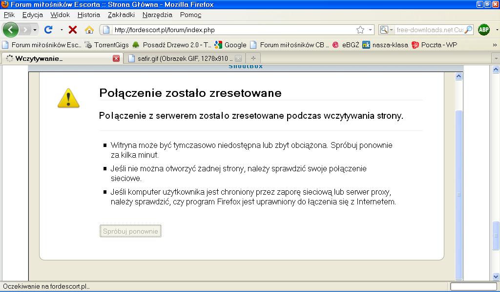 nie wiem czy w katalogu głównym forum jest folder tmp, jeśli nie ma to trzeba utworzyć, musi mieć chmod nadany na 755, innym problemem może być upload_max_filesize ustawiony na jakiś mały, więcej informacji tutaj: http://phpbb.davidiq.com/viewtopic.php?t=10 problemem z zrywaniem połączenia może też być treść pliku .htaccess tutaj WieSiu musiałby sprawdzić w logach serwera co się dzieje.
