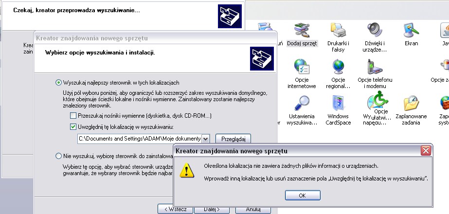 pokaż dokładną ścieżkę którą podałeś. a rozpakowałeś plik? nie widzi plików ze sterownikami, to jest problem. ale dlaczego?