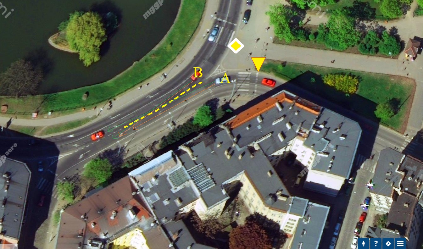 1. Linie pomarańczowe: Samochód B ma znak pierwszeństwa, jednak aby pojechać w lewo musi zmienić pas. Czy pojazd A ma jechać jakby nigdy nic?