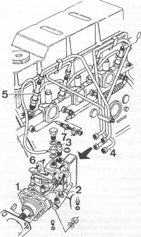 1 &#8212;pompa wtryskowa, 2 &#8212; korektor wyprzedzenia wtrysku zimnego silnika, 3&#8212;zawór elektromagnetyczny zatrzymania silnika (zawór STOP), 4&#8212; przewód wtryskowy, 5 &#8212;wtryskiwacz, 6&#8212;przewód powro