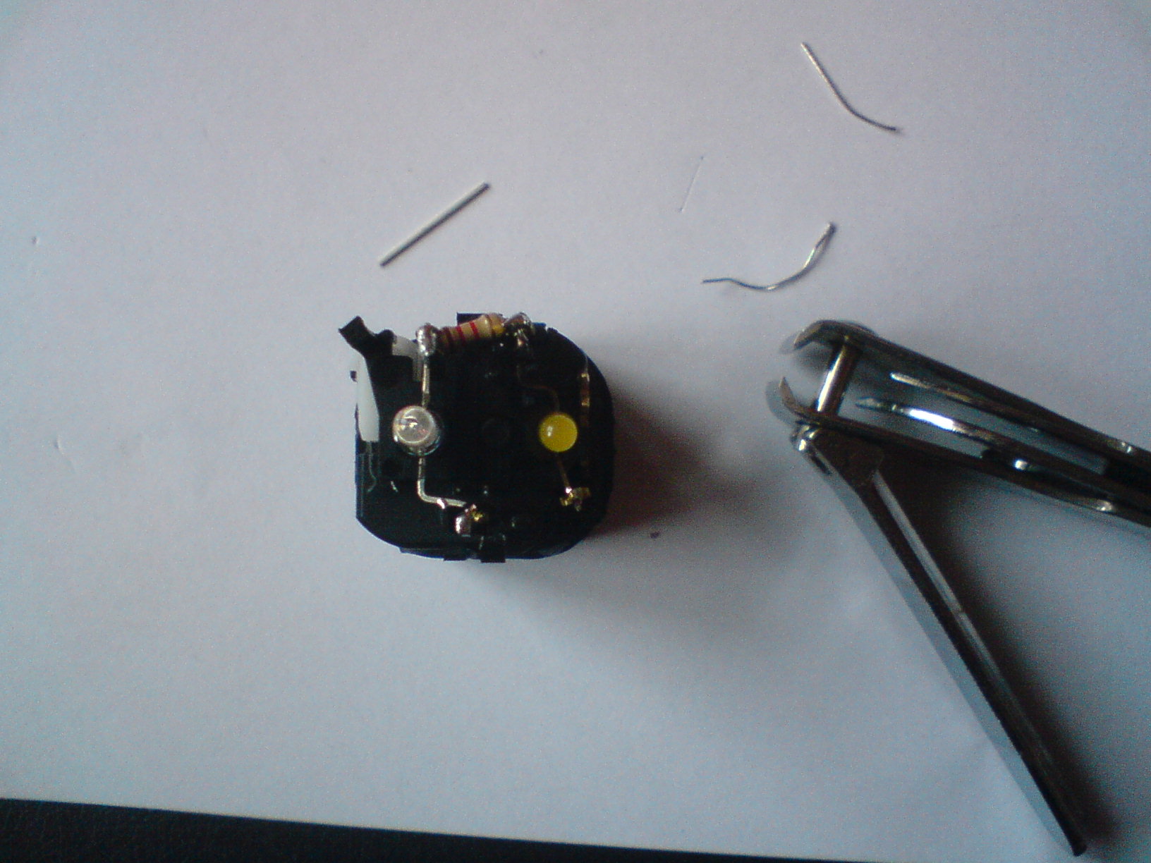 następnie bierzemy diode własną, za pomocą pęsety zaginamy krótszą nóżkę dokładnie tak jak było w diodzie fabrycznej, natomiast dłuższą wypuszczamy prosto tak jak na fot 4