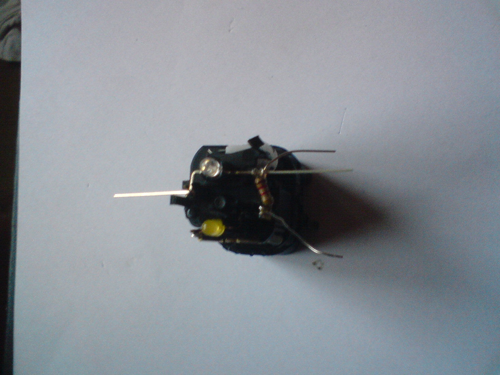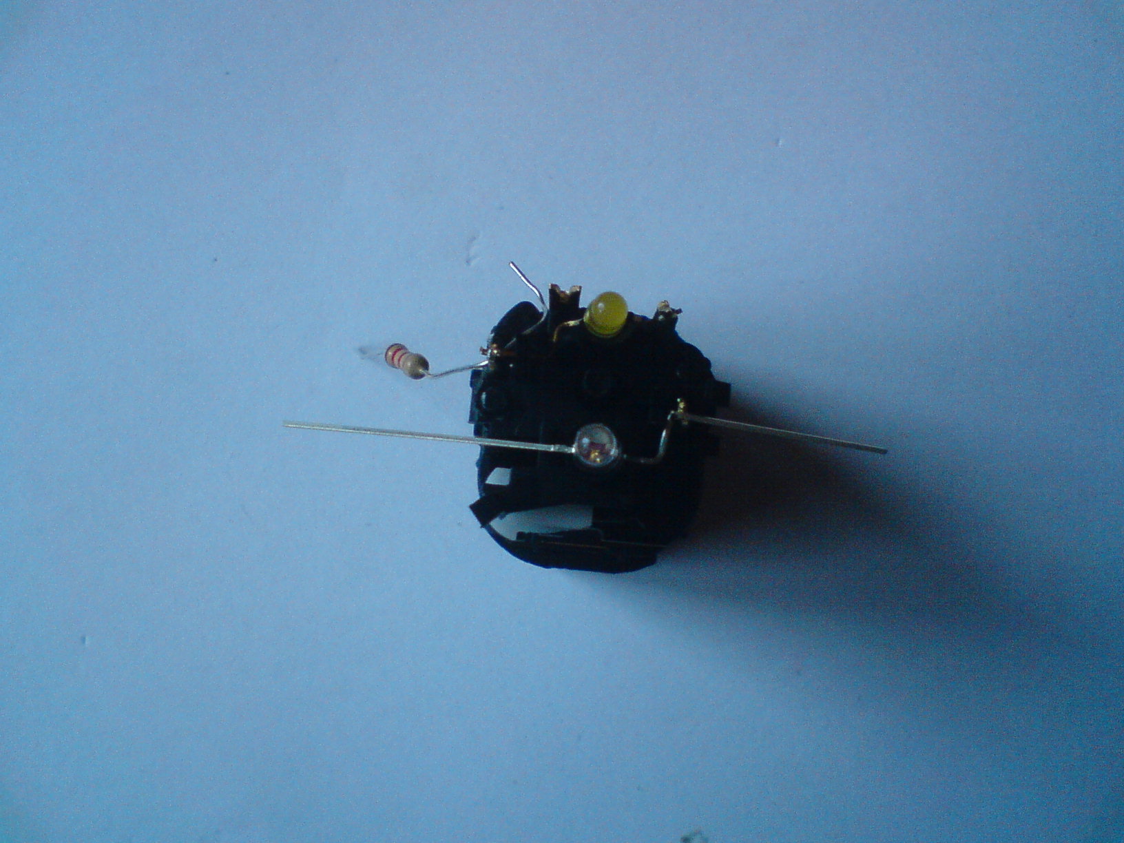 potem przez dziurkę w jednej z nóżek gdzie mocowana była zielona dioda przekładamy nóżkę rezystora (fot 5) "od zewnątrz do środka" i potem górą przez "widełki" na zewnątrz