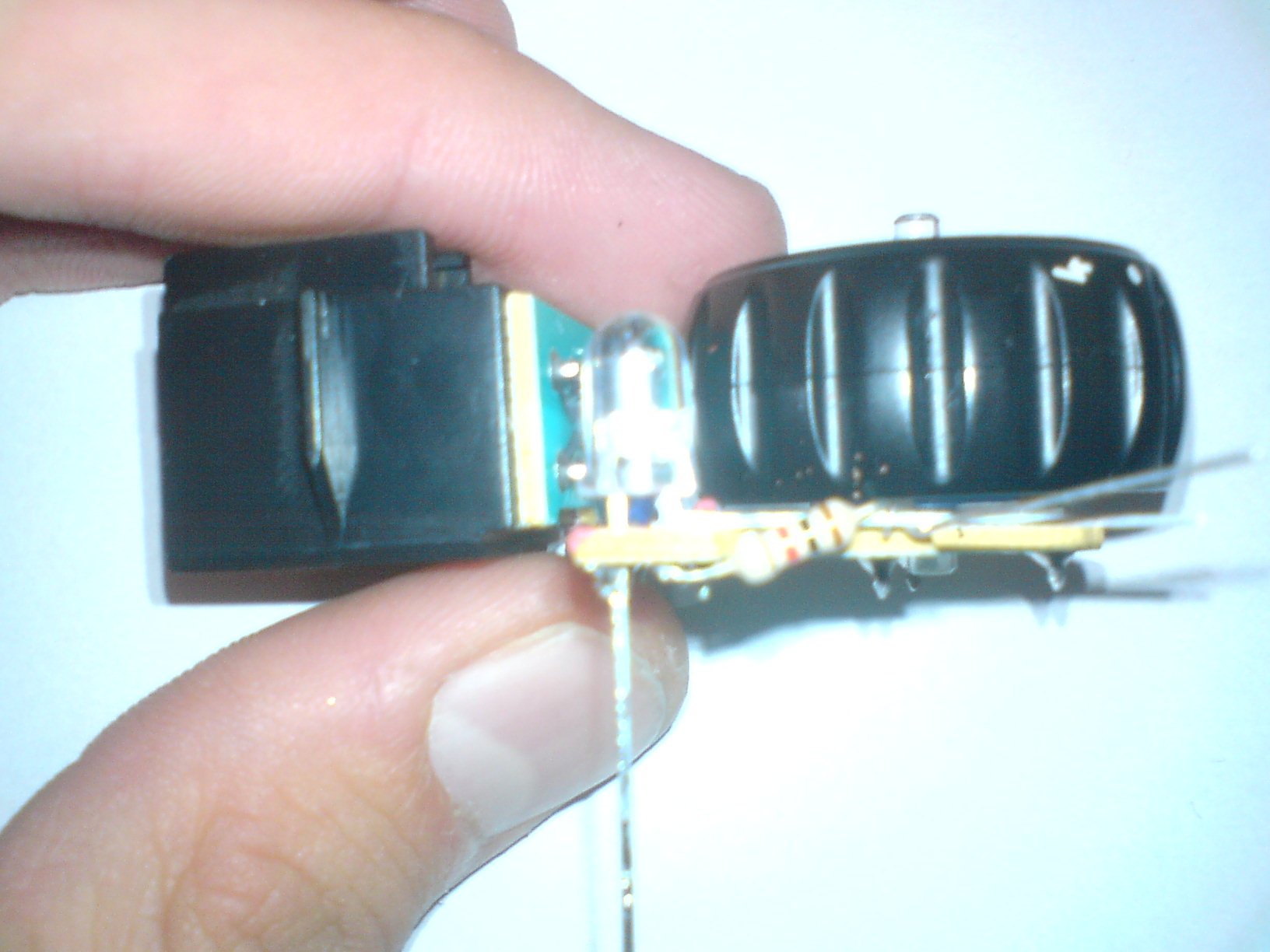 zieloną diode wycinamy obcinaczkami do paznokci przy samej blaszce do której są zamocowane jej nóżki, potem te blaszke rozginamy obcinaczkami lub śrubokrętem (jak zobaczycie będziecie wiedzieli o co chodzi)