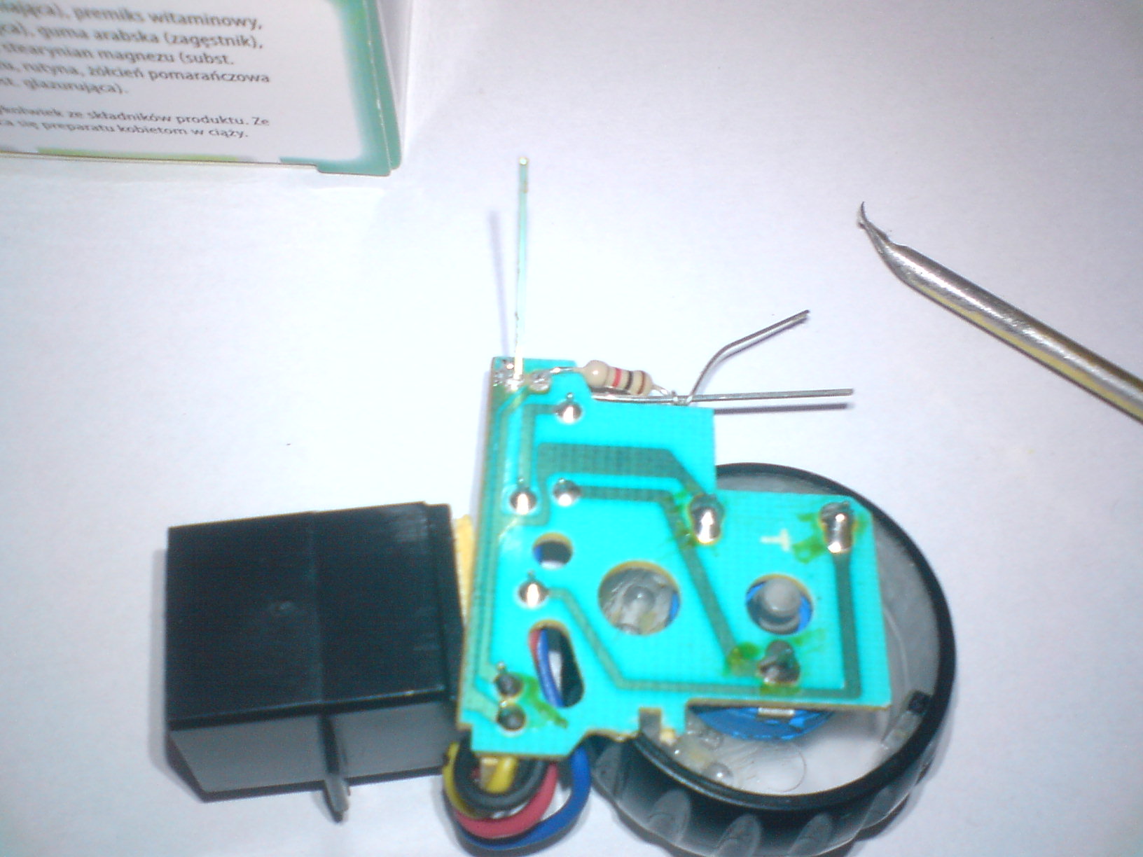 teraz lutujemy rezystor do 1 blaszki, potem rezystor do diody i diode do 2 blaszki