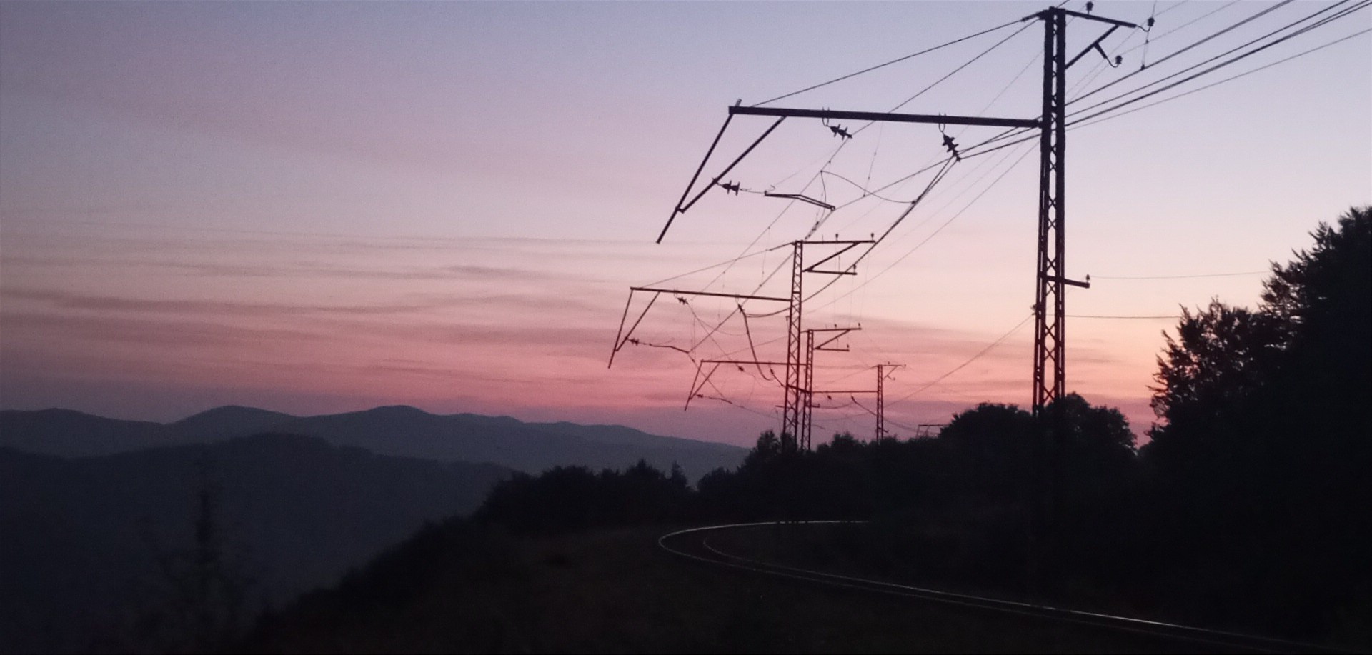 Przepiękny widok na Zakarpacie po zachodzie słońca z biegnąca obok linią kolejową na Uzhorod. Okolice Użoka.