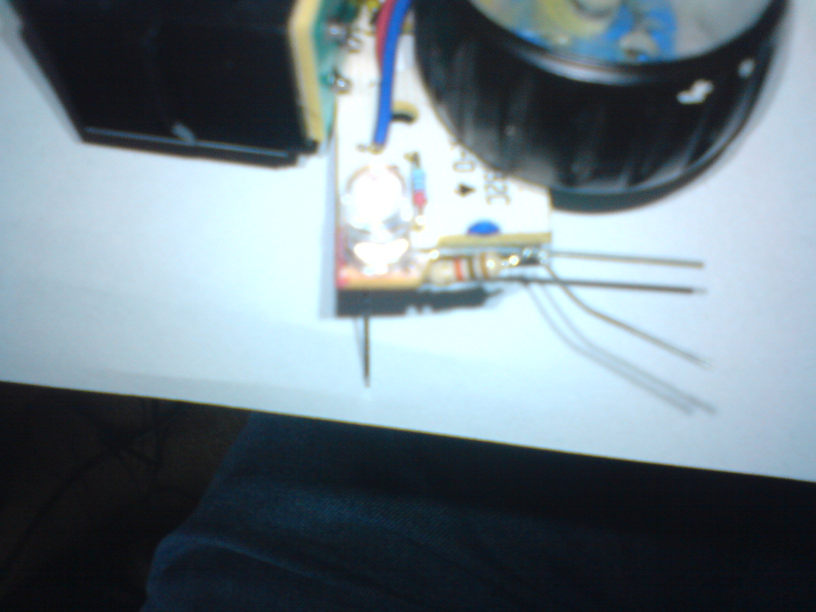 teraz do + żarówki należy wlutować dłuższą nóżkę diody na takiej wysokości aby krótsza zagięta nóżka nie dotknęła płytki