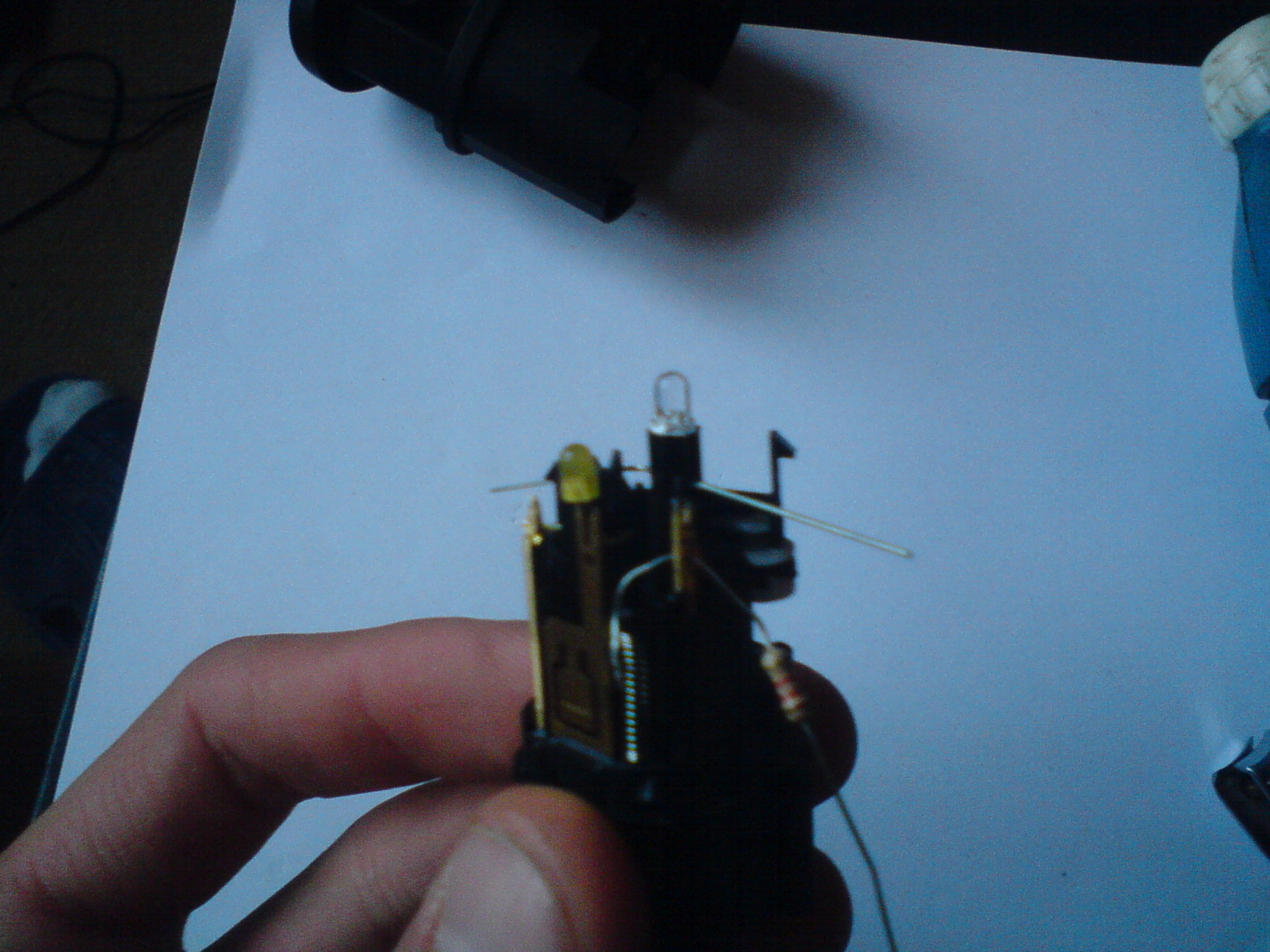 potem przez dziurkę w jednej z nóżek gdzie mocowana była zielona dioda przekładamy nóżkę rezystora (fot 5) "od zewnątrz do środka" i potem górą przez "widełki" na zewnątrz
