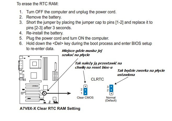Reset biosa można robić na trzy sposoby. Najprostszy jak ktoś nie umie odnaleźć zworki na płycie to wyciągnięcie baterii z płyty na 30 minut (pamiętaj o odpięciu kompa od gniazdka.