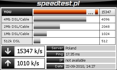Dokładnie tak jak Yagr napisał. Niektóre strony wskażą rzeczywistą prędkość, niektóre pokażą tę prędkość, która jest możliwa jeszcze z naszego łącza. Aby test był bardzo wiarygodny to należy zamknąć wszystkie aplikacje korzystające z sieci, czyli dla przykładu: GG, Skype, klientów P2P (toorenty np.) i tym podobne, a następnie uruchomić test. Ale nie do końca. W przypadku łacza takiego jak mam ja czy Lukas, ciężko znaleźć serwer, który za nami nadąży. Więc tak naprawdę osoby z "normalnym" łączem mogą wiarygodnie sprawdzić prędkość, ale osoby z nazwijmy umownie "huraganem" nie będą miały nigdy wiarygodnego wyniku. Prędkość łącza w tych przypadkach to jedno, a wydajność modemów, routerów to drugie. Jest to bardzo złożone zagadnienie i dość trudne do wytłumaczenia. Nie mniej jakiś wskaźnik jest...