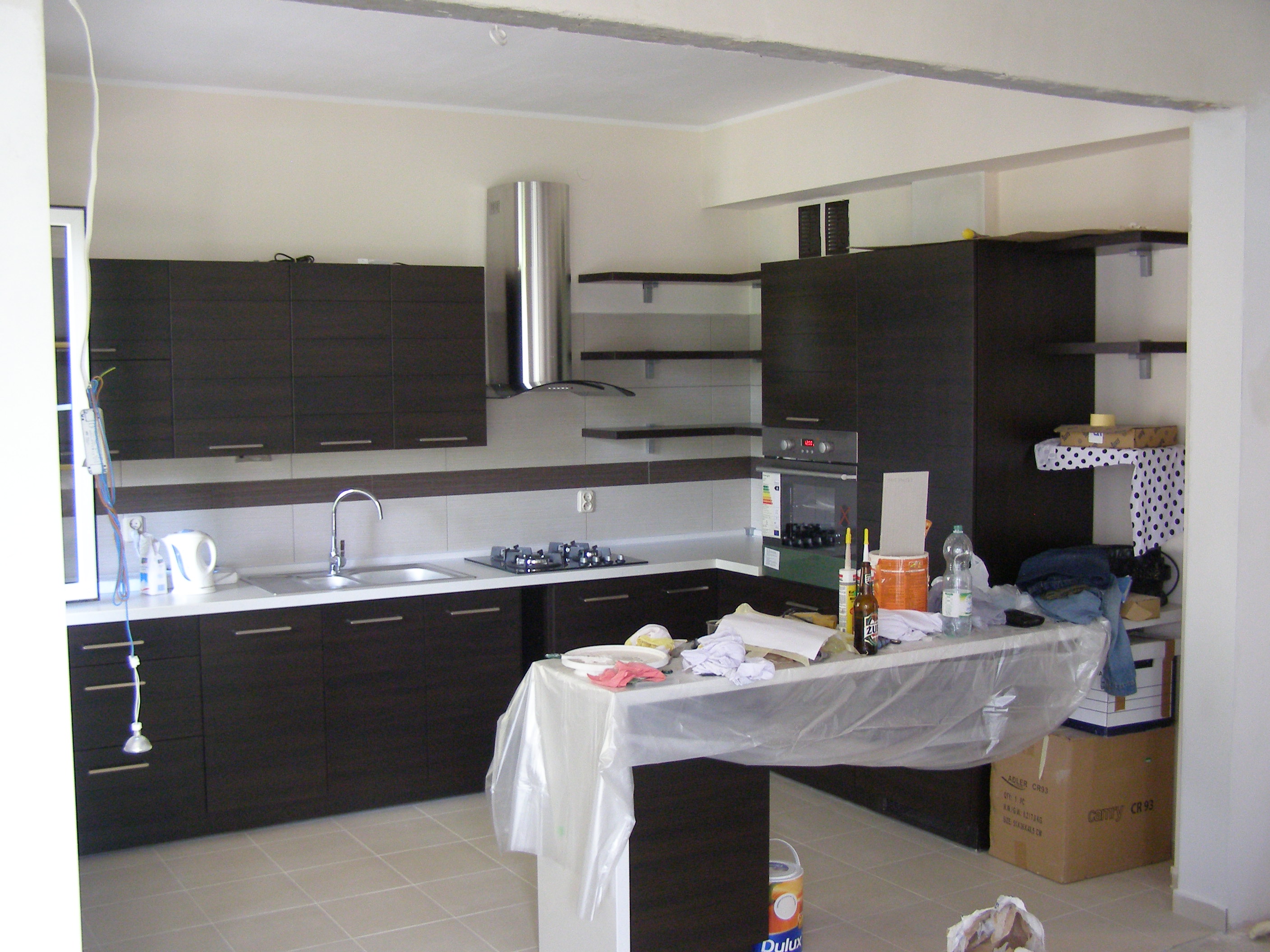 Kuchnia skończona w 99%. Brakuje odrobinę domalować, dokleić 4 płytki, zafugować szyld. Wysprzątana i czysta (tak na odbiór). Na koniec sypialnia. Pokój jak pokój - wykończony w 90%. Jutro być może update łazienki będzie. Później salon, hol, gabinet...