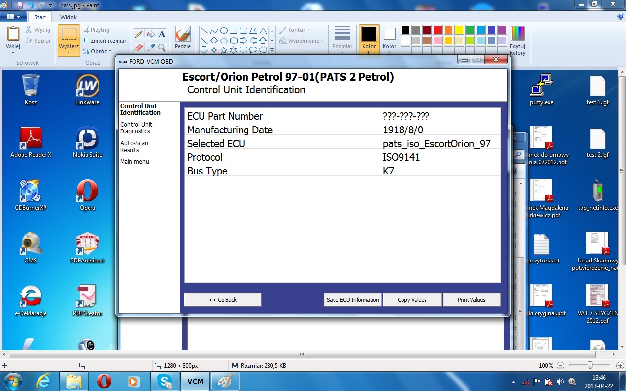 Sprawdzilem tez intefejs mini VCM IDS i udalo sie polaczyc z RSem,ale tylko z modulem PATS,wiec ogolnie interfejs dziala,ale jak juz pisano - nie z RSami. W Scorpio bez problemu zagadal. Ciekawa date wypluł ;)