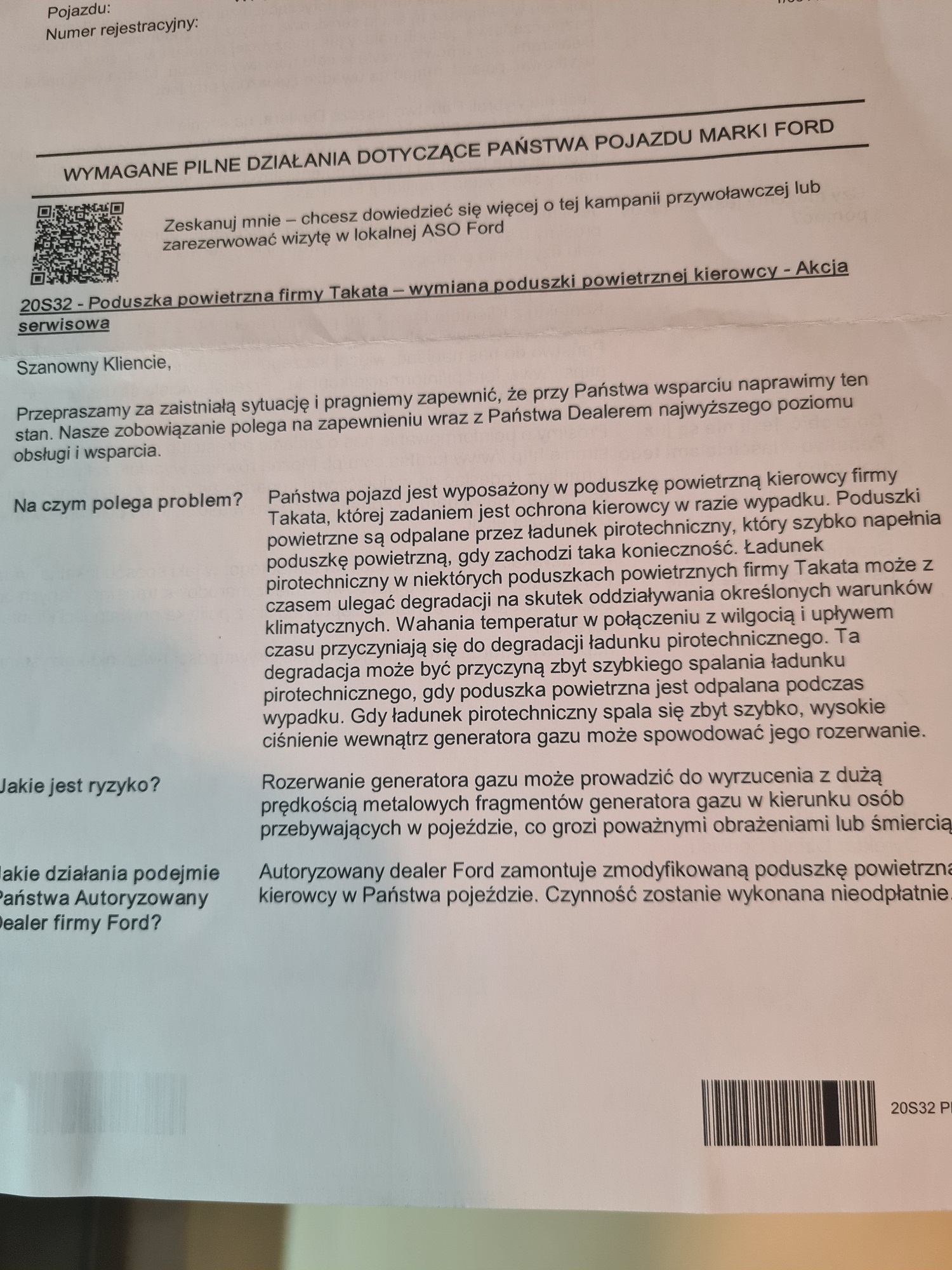 Wezwanie - akcja serwisowa - wymiana poduszki kierownicy