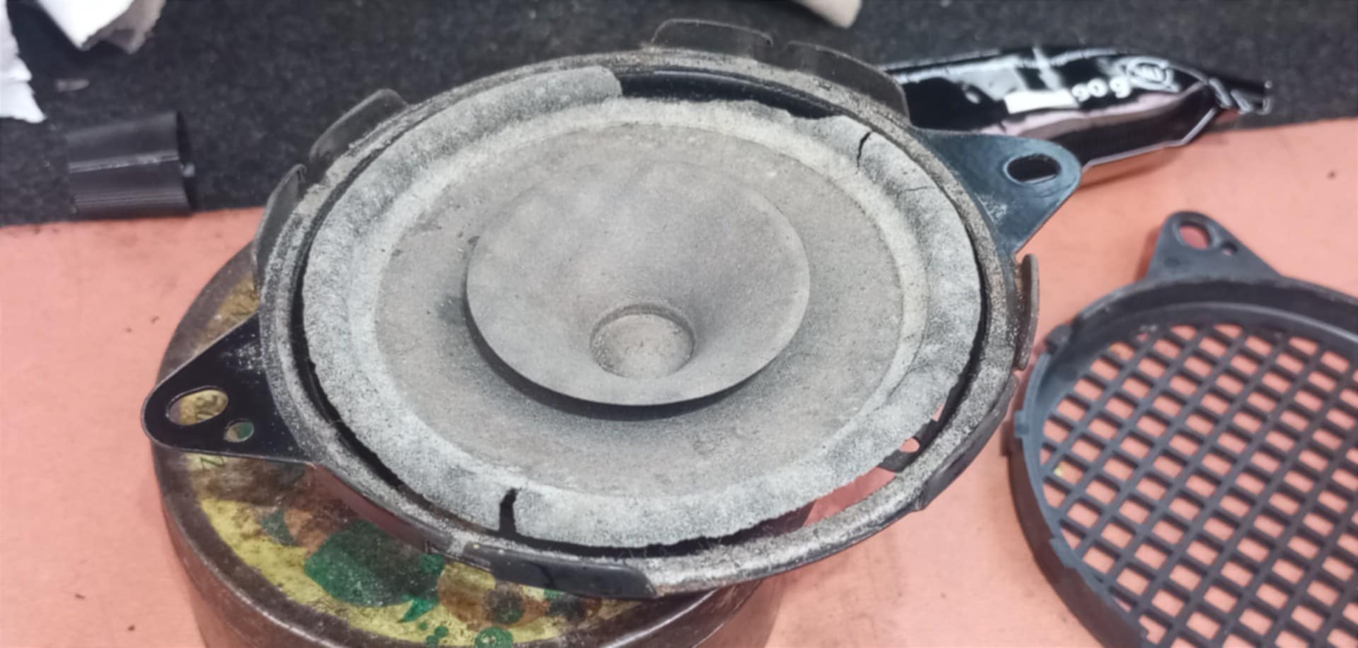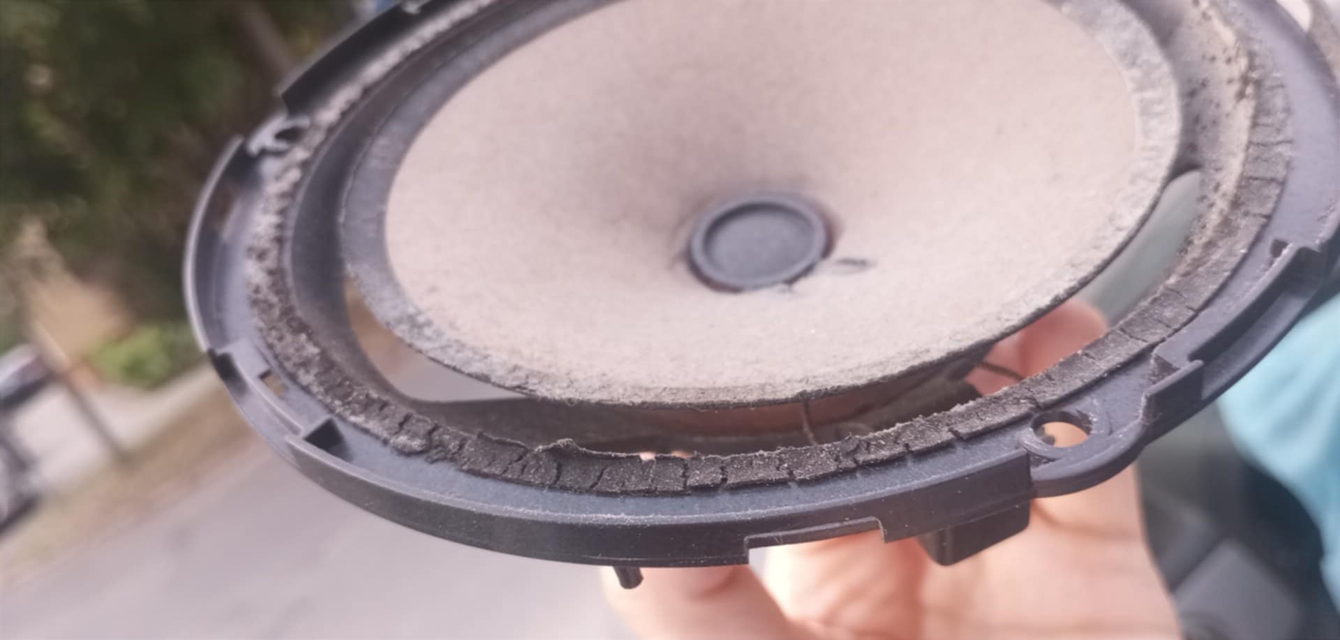 Zdegradowany do granic możliwości woofer w drzwi przednich