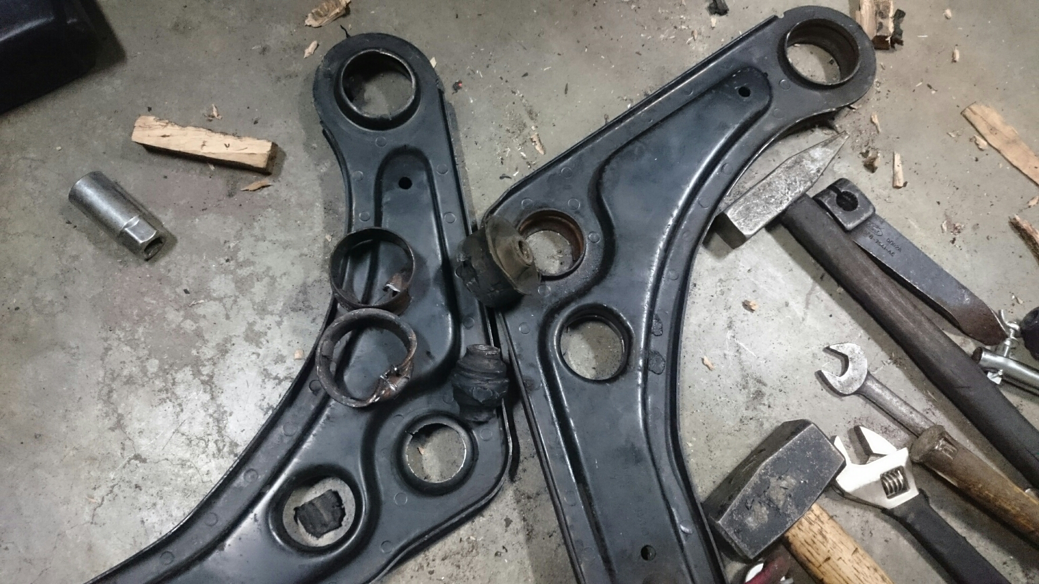 Wybilem z wahaczy oryginalnych tuleje, łatwe to nie było, mam nadzieję ze pouliuretany siądą łatwiej niż wyciąganie starych tuleji