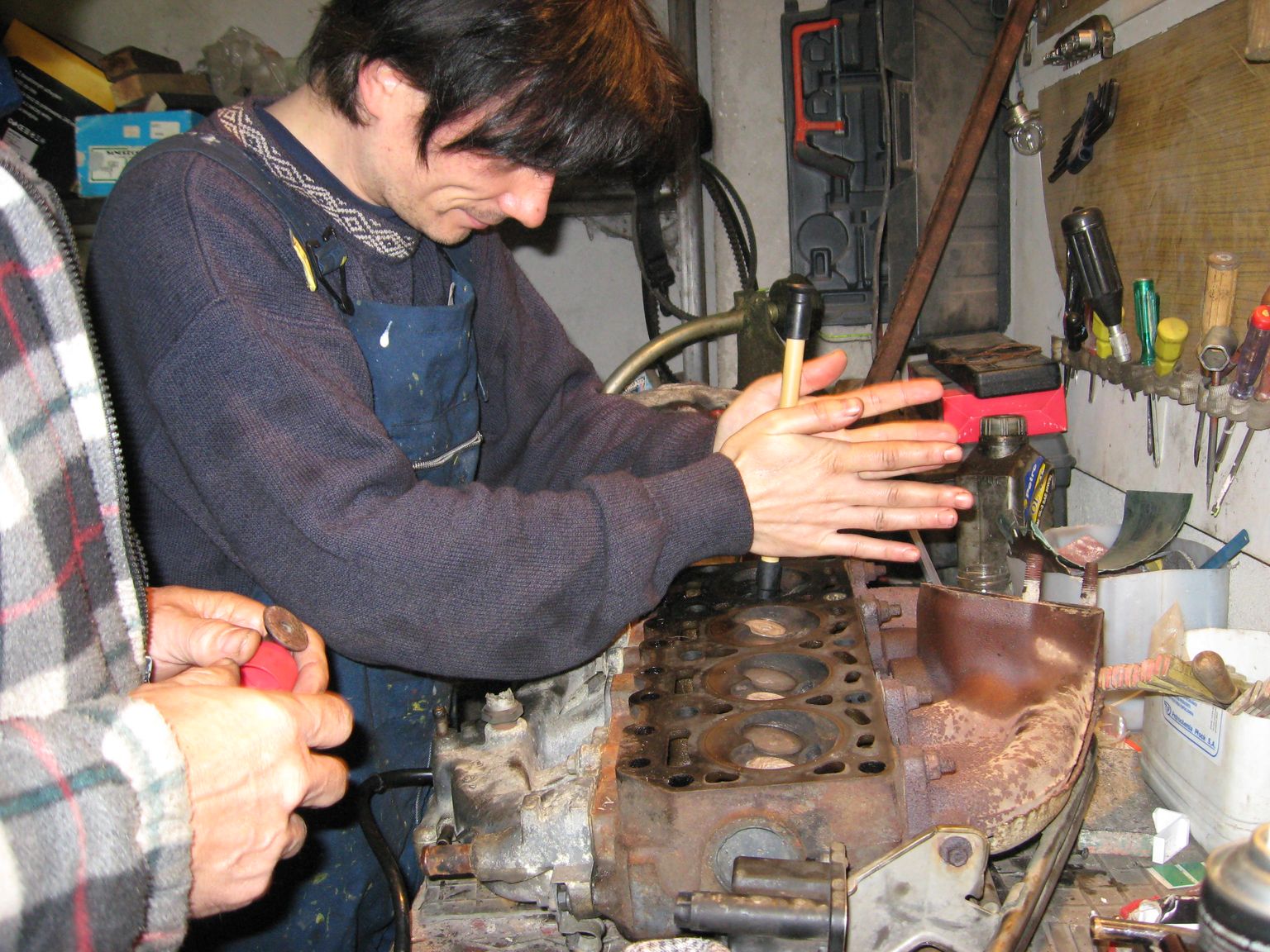 Dalej szło zupełnie sprawnie. Zdjęliśmy głowicę, miskę olejową. Odkręciliśmy korbowody i wyjęliśmy tłoki. ( parami, przekręcając silnik zgodnie z górnym położeniem i dolnym) Jak widać na zdjęciach zanieczyszczone potężnie. Zawory też ściągnęliśmy, było z tym trochę zabawy ale w sumie całkiem przyjemna robota. Na jednym zdjęciu mam w ręku docieraczkę do zaworów i właśnie docieram zawór. Zawory były oczywiście także z dużym nagarem. Przeczyściliśmy, przetarliśmy i założyliśmy nowe uszczelniacze zaworowe.
