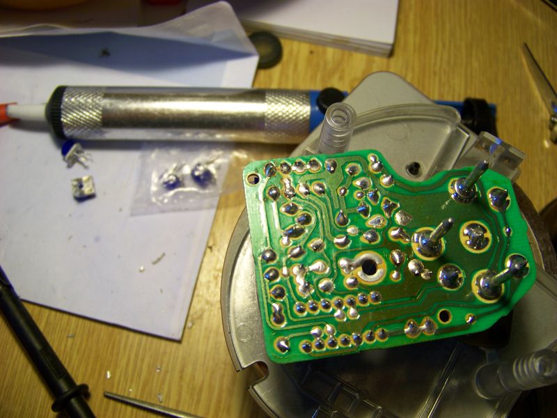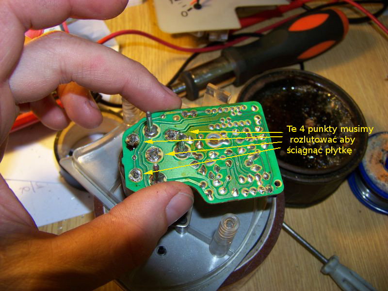 1. płytka obrotomierza z zaznaczonymi punktami do rozlutowania - tu z odessaną już cyną - odsysacz do cyny jest tu bardzo przydatny