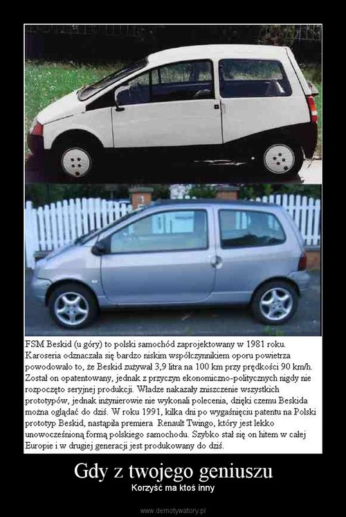 Ja słyszałem, od dawna to wiadomo, dawno o tym mówili że zaraz po wygaśnięciu patentu na Beskida pojawiło się na rynku Twingo, które jest w zasadzie jego kopią. Niestety radzieckie rządy w zasadzie całkowicie zniszczyły Polski przemysł motoryzacyjny. Poszukaj sobie więcej projektów Polskich inżynierów, jest na co popatrzeć, a zachód miałby nam czego zazdrościć, gdyby tylko mogli wprowadzić w życie wszystkie swoje pomysły.